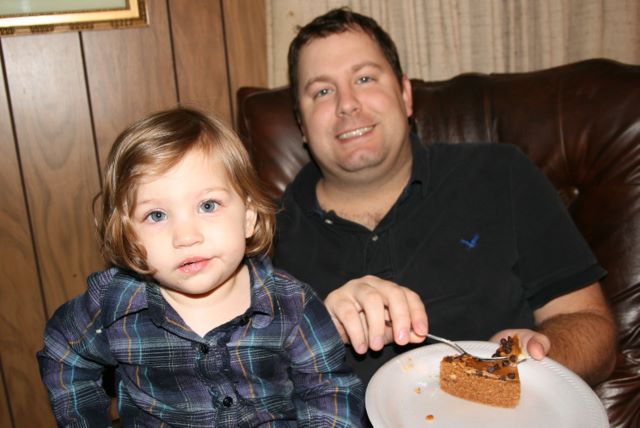 20101124Tday -- Aubrey sneeking some cheesecake with her daddy