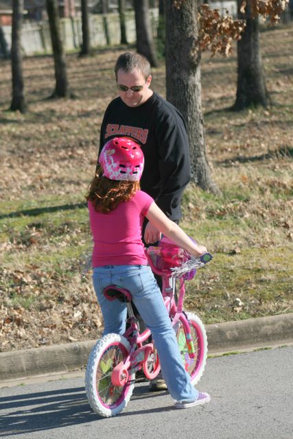 20120301Girls -- Daddy trying to give her a pep talk...luckily bike riding isn't a requirement for college....