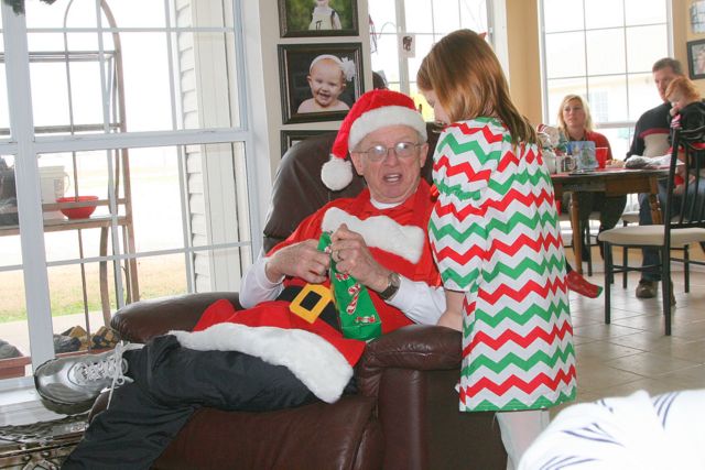 20131225Xmas -- Averi giving Papaw his present from her