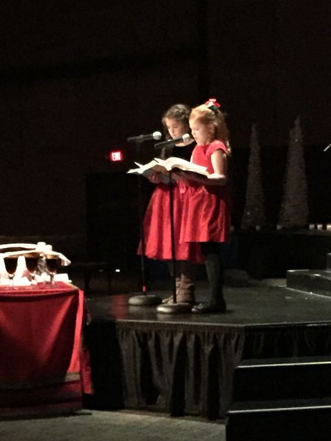20141225Xmas -- Averi reading with Madelyn at church